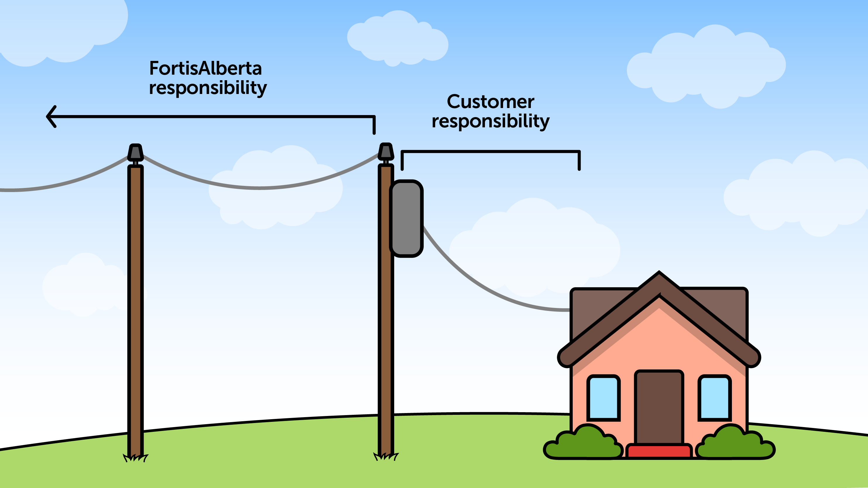 FortisAlberta is responsible for maintaining the required setbacks in the sections from pole-to-pole, while customers are responsible for the area around the final pole-to-house (or business) service line.