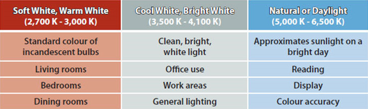 Choosing the right colour tone is also important in keeping with your usual level of comfort at home. The table below shows a comparison of light temperatures and recommended rooms around the home.